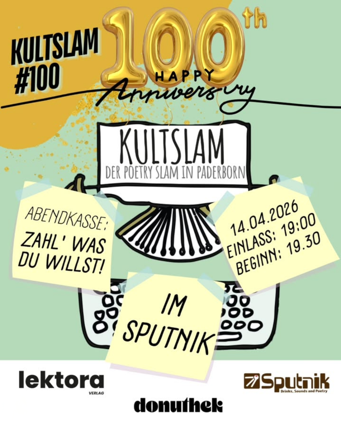 Der 100. Kultslam findet am 14.04. Um 19:00 Uhr statt und wir freuen uns riesig, dieses besondere Jubiläum gemeinsam mit euch zu feiern!